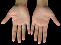 二十岁的人,身体内脏的发育基本成熟了,这时手掌上的1、2、3线随着身体的发育变得深而且长,手掌色泽红白匀称。十指圆润有力,拇指根部的摺纹深长。由于性腺的成熟,体内出现性激素的正常分泌,所以大鱼际和小鱼际都相对比其它部位隆起,而且这两个鱼际的高度遥遥相对,八卦的各部位也开始丰满起来了。骨肉相裹而均匀。手掌上没有青筋显露的现象。这些表示是健康的年轻人。
